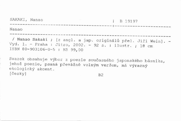 Autor | Nanao Sakaki ; [z angl. a jap. originálů přel. Jiří Wein] |