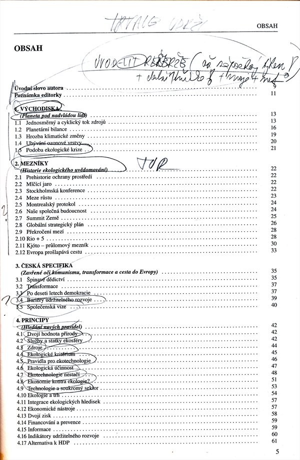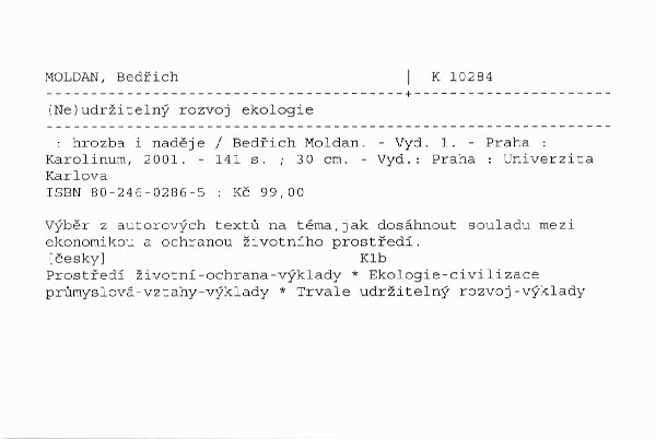 Publikace se zabývá vysvětlením koncepce trvale udržitelného rozvoje. Podstatou myšlenky je sladit hospodářskou činnost člověka a ekonomický rozvoj států světa s účinnou ochranou přírodních zdrojů. I když tuto myšlenku formulovala Světová komise pro životní prostředí při OSN již v roce 1987 a v České republice byl pojem definován zákonem /1992/, není tato myšlenka veřejnosti příliš známá. Publikace představuje výběr z textů Bedřicha Moldana, které obsah pojmu vysvětlují. V jednotlivých kapitolách se autor zabývá historií ekologie, českými specifiky, světovou ekologickou politikou a některými konkrétními rozporuplnými případy. Vhodné i pro studenty.