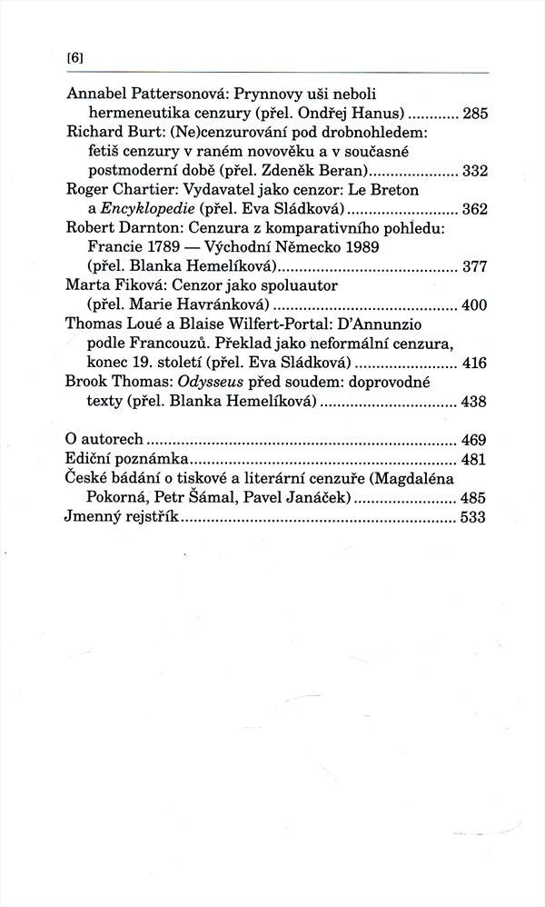 Antologie prezentuje studie významných literárních teoretiků a filozofů k problematice literární cenzury s exkurzem do historie, až po současné zkoumání tohoto fenoménu v mezinárodním měřítku.