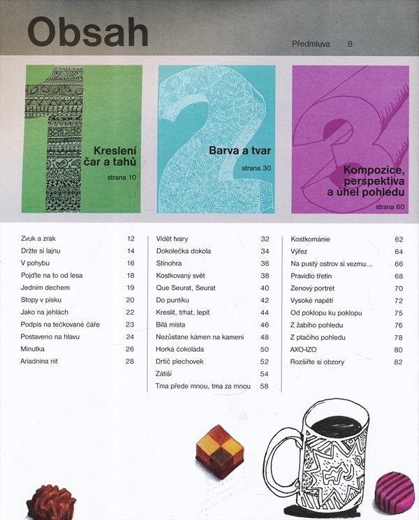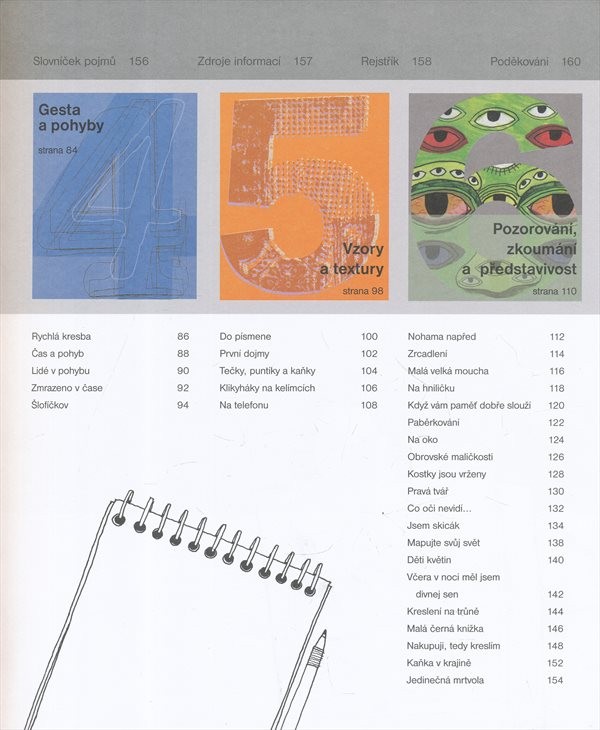 Výklad postupuje od základů kresby (čáry, tahy). Následují kapitoly věnované významu světla a stínu při zobrazování tvarů, kompozici, ztvárnění gest a pohybu, vzorům a texturám. Poslední část se zabývá rozvíjením vlastní představivosti. Nabízí inspiraci a umožňuje rozšířit náš výtvarný repertoár prostřednictvím různých kombinovaných technik.