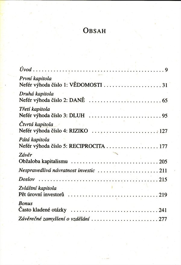 Autor světově prodávaného titulu "Bohatý táta, chudý táta" opět boří veškeré mýty o nutnosti či dokonce předurčenosti "obyčejných" lidí setrvávat ve stávající neútěšné finanční situaci. Řešením je získat pro život nezbytné finanční vzdělání. Příručka se zabývá pěti neférovými výhodami, které finanční vzdělání nabízí.