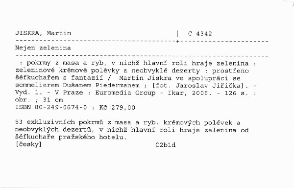 | Podnázev | pokrmy z masa a ryb, v nichž hlavní roli hraje zelenina : zeleninové krémové polévky a neobvyklé dezerty : prostřeno šéfkuchařem s fantazií |