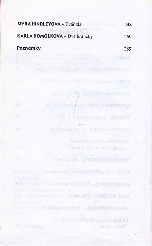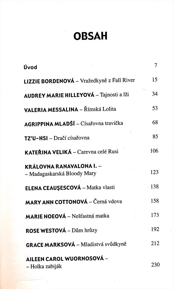 Kniha detailně popisuje životní osudy patnácti žen, od 1. století po současnost, které z nejrůznějších důvodů zabíjely.