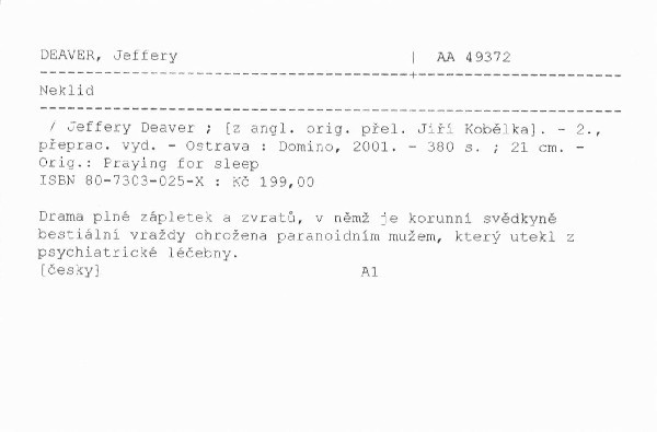 | Autor | Jeffery Deaver ; [z angl. orig. přel. Jiří Kobělka] |