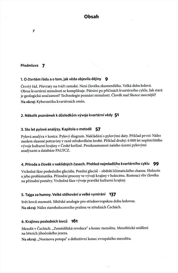 Kniha pojednává o vývoji bádání ve čtvrtohorách, pylové analýze, která slouží k výzkumu historie vegetace, průběhu současného čtvrtohorního klimatického cyklu, přírodních poměrech a životě lidí na našem území v průběhu mezolitu (střední doba kamenná), utváření české krajiny ve čtvrtohorách, zániku našich pralesů, vzestupu a pádu keltského hradiště na hoře Vladař nebo historickému vývoji vybraných biotopů v ČR. Součástí textu je přehled literatury, slovníček odborných pojmů, rejstřík a fotografie.