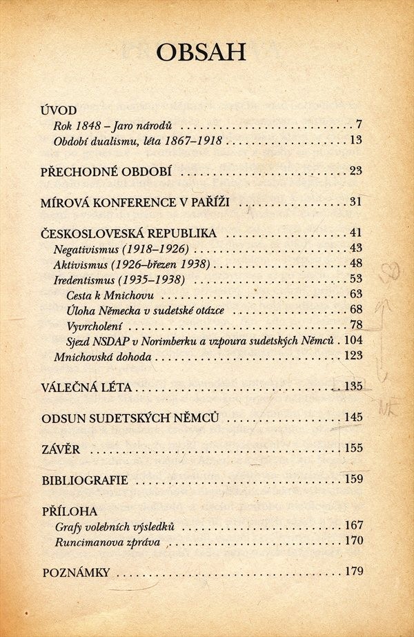 Studie. Češi a Němci v revoluci 1848. Pangermánství a austroslavismus. Národní obrození. Ekonomická a politická emancipace českého národního živlu. Česko-německý antagonismus. První světová válka, rozpad monarchie, pařížská mírová jednání a vznik ČSR. Národnostní politika samostatného československého státu. Německé aktivistické a iredentistické politické proudy. Mnichovská dohoda, okupace a odsun. Těžiště práce je v období 1848-1938. Válečné období je zmíněno pouze z hlediska aktivit českého zahraničního odboje a jeho plánů na realizaci odsunu. O odsunu pouze základní fakta a čísla.