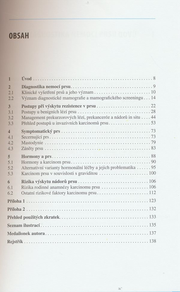 Dominantním tématem je karcinom prsu, jehož vysoká incidence začíná být celospolečenským problémem rozvinutých zemí, včetně České republiky. Symptomatologie nemocí prsu je velmi jednoduchá a uniformní, bohužel, jedná-li se o karcinom prsu, bývá příznakem pozdním. Kniha se však rozhodně nezaměřuje pouze na problematiku karcinomu, precizně a moderně je vyloženo celé spektrum nemocí prsu, včetně zánětů (puerperální i nonpuerperální mastitida), mastodynie, přetrvávající sekrece z prsu i další mastopatie. U každého tématu je velmi prakticky a přehledně uvedena jak diagnostika, tak běžná i méně běžná medikace. Nakladatelská anotace. Kráceno.