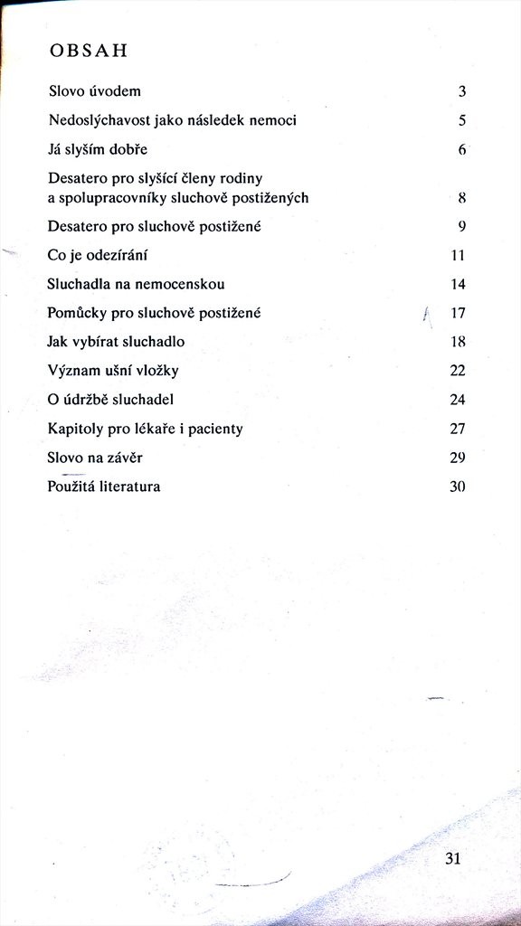 Publikace určená široké veřejnosti informuje především o stařecké nedoslýchavosti, ale varuje i před čím dál častějšími poruchami sluchu u mladých lidí způsobenými především hlučnou hudbou, walkmany apod. Vysvětluje příčiny nedoslýchavosti a upozorňuje na nejdůležitější zásady, jak pro sluchově postižené, tak pro jejich příbuzné a spolupracovníky. Větší část brožury je věnovaná pomůckám pro sluchově postižené /naslouchadlům/, jejich správnému výběru a údržbě.