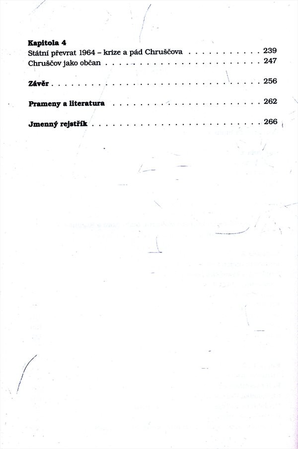 Práce sleduje Chruščovův soukromý i politický život až do roku 1953, kdy se dostal do čela KSSS, eliminaci jeho politických odpůrců, kroky sovětské diplomacie na mezinárodní scéně (vztahy k ostatním komunistickým zemím, zlepšení vztahů se Západem atd.), vnitropolitickou situaci v SSSR v čase Chruščovovy vlády (např. rehabilitace politických vězňů), zdejší hospodářské poměry, Chruščovovu kulturní politiku nebo postavení pravoslavné církve v letech 1953-1964. Pozornost je věnována rovněž Chruščovovu pádu v roce 1964 a popisu posledních let života tohoto politika. Poznámky, fotografie.