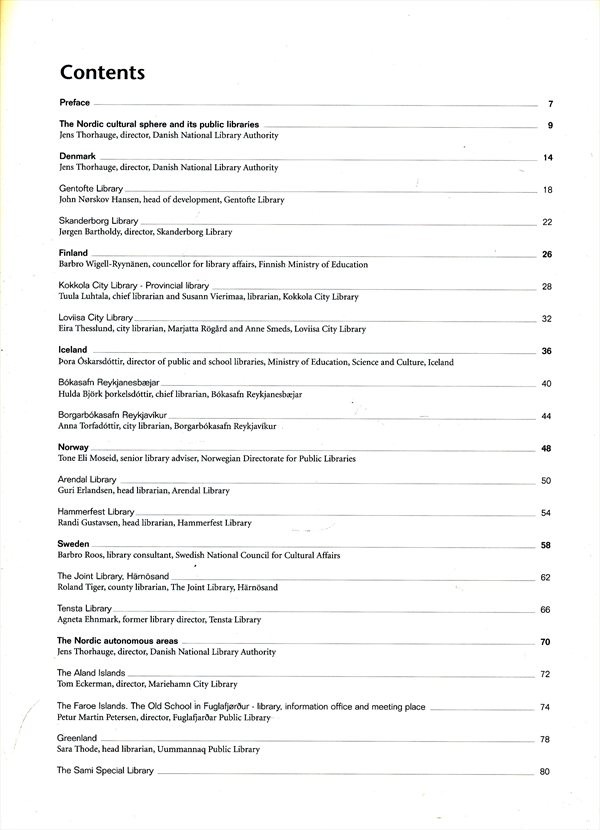 Monografie provádí veřejnými knihovnami skandinávských zemí a popisuje jejich systém služeb. Kniha obsahuje fotgrafie interiérů vybraných knihoven.