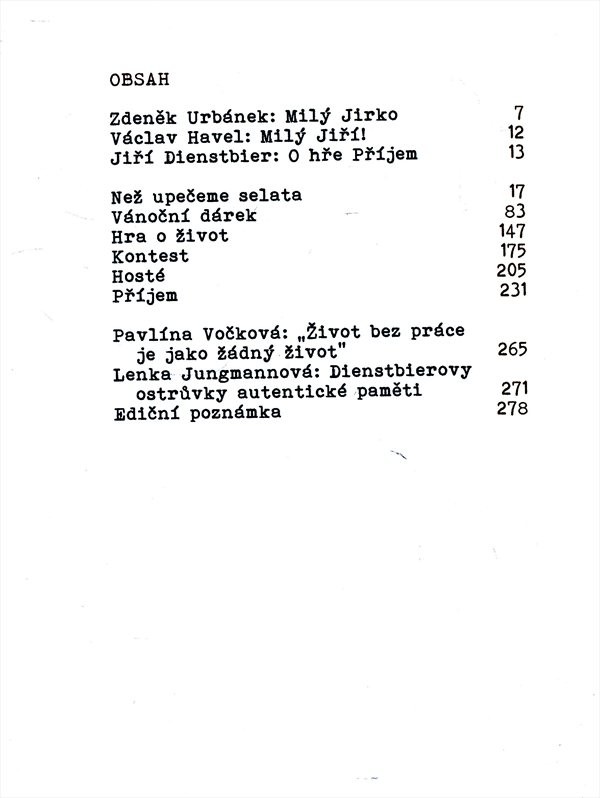 Soubor šesti divadelních her českého novináře, politika a disidenta Jiřího Dienstbiera reflektujících domácí společensko-politickou realitu 70. a 80. let 20. století.