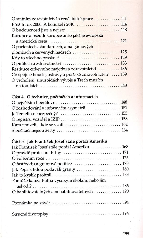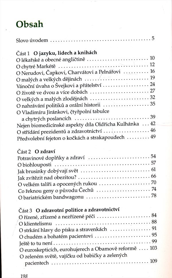 Tematický záběr fejetonů je široký: od aktualních problémů v českém zdravotnictví, praktických důsledků politických rozhodnutí přes vyzdvihnutí typických rysů české povahy ke vztahu k jídlu či potravinovým doplňkům. Především vtipný a výstižný popis české společnosti počátku 21. století.