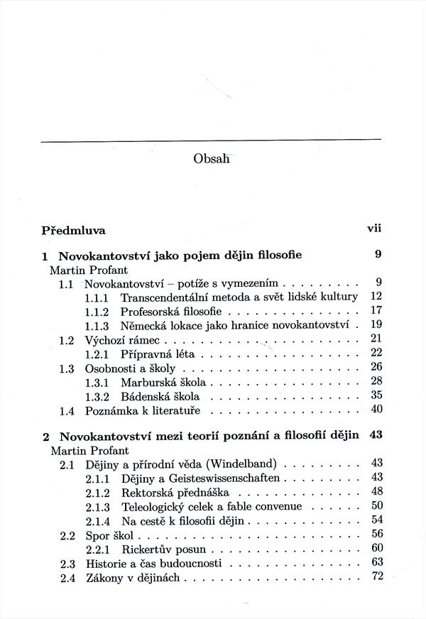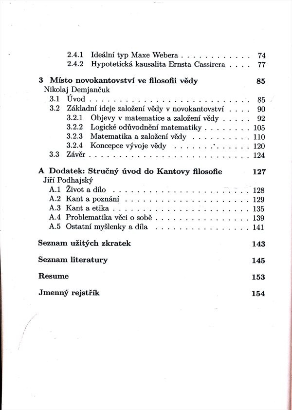 Monografie přináší odpovědi filozofů novokantovství na otázky vědeckého poznání, lidské svobody, nebo toho, zda považovat historii, literární vědu nebo sociologii za vědu, nebo za uměleckou naraci.