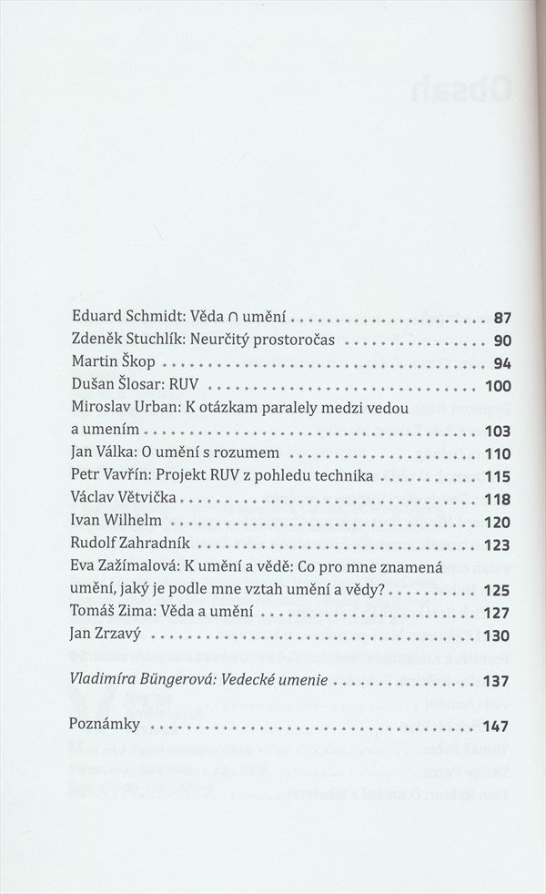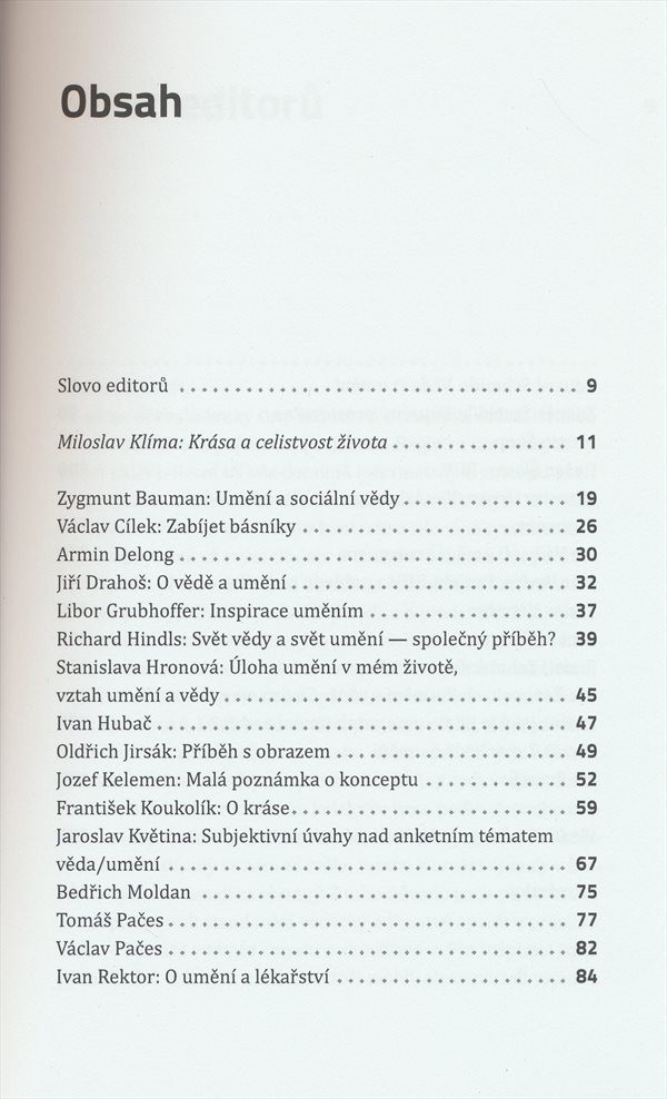 Soubor textů, v nichž se představitelé exaktních vědeckých oborů a odborníci ve společenských a humanitních vědách vyjadřují ke svému vztahu k umění a ke vztahu mezi uměním a vědou.