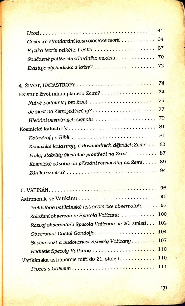 Publikace je souborem článků, které autor publikoval v 90. letech 20. století v časopise Universum. Články a úvahy se týkají většinou otázek vzniku vesmíru, velkého třesku, budoucnosti Země a perspektivního vývoje našeho Slunce. Ve svých úvahách se autor dotýká též otázek víry - nakolik věda vylučuje víru, zdali je velký třesk potvrzením o stvoření světa Bohem. Závěrečné články se zabývají historií astronomických pozorování ve Vatikánu.