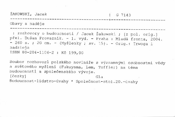 Soubor rozhovorů polského novináře s významnými osobnostmi vědy a světového myšlení (Fukuyama, Lem, Toffler) na téma budoucnosti a společenského vývoje.