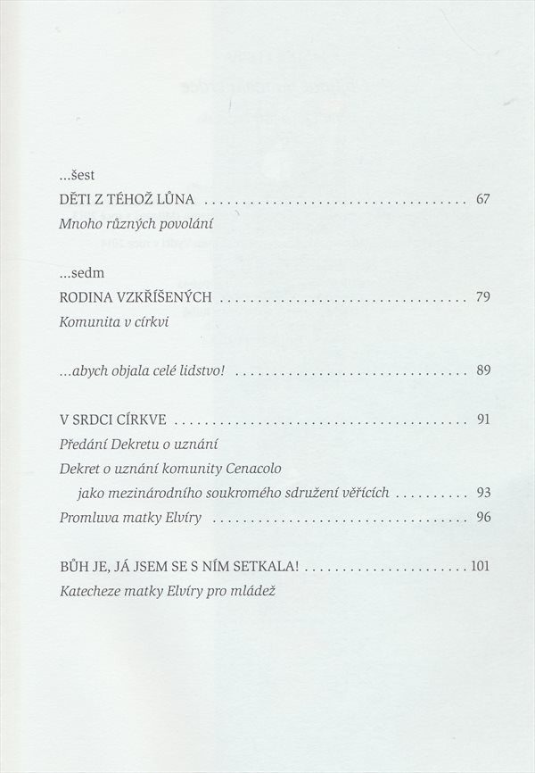 Autobiografické vzpomínky italské řeholnice matky Elvíry, zakladatelky komunity Cenacolo k léčbě drogově závislých. Připojeny dokumenty o církevním uznání komunity a promluvy matky Elvíry.