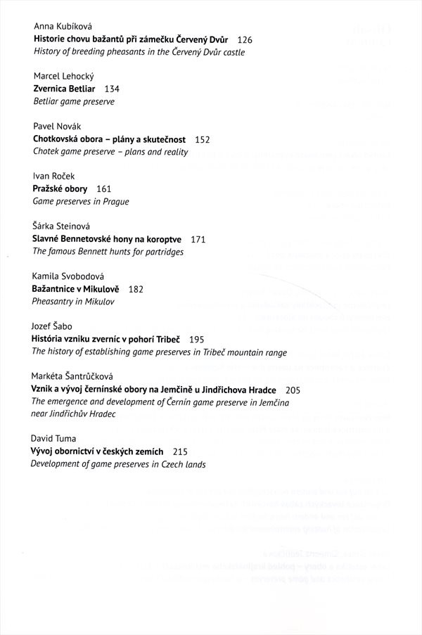 Sborník z edice Prameny a studie obsahuje příspěvky z mezinárodní konference. Studie a články se věnují historii vzniku obor a chovu zvěře na území Česka a Slovenska, zabývají se historií budování bažantnic a dalších zařízení pro chov pernaté zvěře.