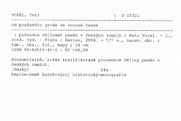 I když sám titul vymezuje přesně časové hranice rozebíraného předmětu, kterým jsou peníze: bankovky a mince, a tvrdí, že kniha sleduje vývoj českých platidel od pražského groše, tj. od roku 1300, autor jde ještě hloub a seznamuje nás i s mincemi staršími: denáry a brakteáty. Chronologicky a velice uceleně nás informuje - pomocí čtivého výkladu, kvalitních vyobrazení, fotografií a přehledných tabulek - nejen o vzniku a historii peněz, ale i o historickém kontextu vždy příslušné etapy dějin. Nalezneme zde i přehled platidel vydaných v českých zemích v letech 1526-2000, včetně všech peněz habsburské monarchie od roku 1657 až po rok 1918. Na konci knihy se nalézají poznámky k jednotlivým kapitolám plus odkazy na prameny a podrobnější literaturu. Podtrženo sečteno, pro laické publikum, stoprocentní výkon.