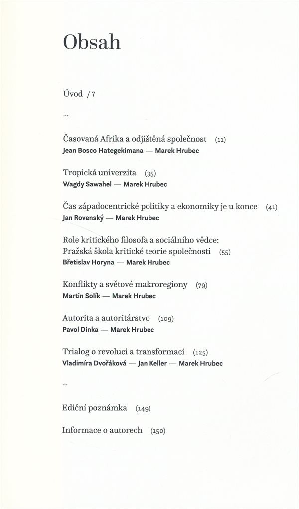 Současný svět se potýká s mnoha problémy, ať už v oblasti sociální, ekonomické, politické či kulturní. Tyto konflikty jsou nezřídka doprovázeny regionálními či globálními ozbrojenými střety, které přináší nejistotu do života mnoha lidí. Rozhovory obsažené v tomto svazku se zabývají touto situací, obsahují kritické úvahy o soudobém systému globálního kapitalismu, hledají východiska a zároveň poukazují na nutnost společenských změn. K problémům současné nejisté společnosti se vedle Marka Hrubce vyjadřují badatelé a odborníci z Burundi, Egypta, Slovenska a Česka (např. politický teoretik Jan Rovenský, filozof Břetislav Horyna, politoložka Vladimíra Dvořáková či sociolog Jan Keller).