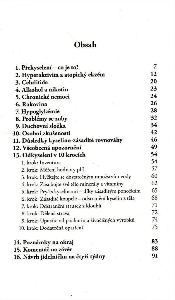 Rovnováha kyselých a zásaditých látek v těle předchází zdravotním potížím, zejména civilizačním nemocem, jako jsou nadváha, celulitida, hyperaktivita či atopický ekzém, a je předpokladem zdravého a dlouhého života. Po vyplavení škodlivých látek z těla potíže zmizí samy od sebe. Autorka představuje v 10 krocích podrobné pokyny k odkyselení. Dále nabízí program stravování na čtyři týdny, který podpoří odkyselovací kúru. Jedná se o převážně zásaditou stravu, která podporuje odstraňování jedovatých látek z organismu.