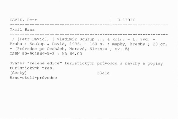 V jediné v současnosti vycházející edici tuzemských turistických průvodců byla zpracována oblast širšího rekreačního zázemí moravské metropole. Těžiště příručky představují návrhy třiceti turistických tras. Popis jednotlivých míst je vkomponován přímo do popisu trasy, stejně tak i informace o otvíracích dobách památkových objektů, kulturních zařízení a provozní době ubytovacích a stravovacíc zařízení. 01.09.2000 dusatkot E3a1a
