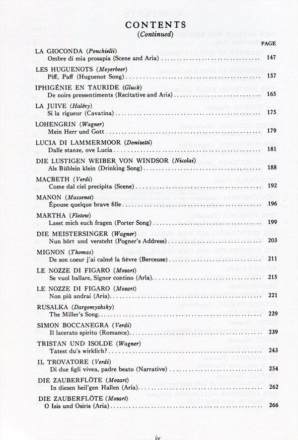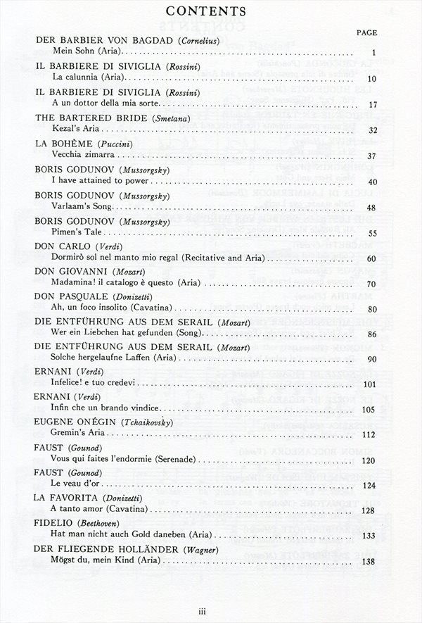 Název dílčí části | Der Barbier von Bagdad.; Mein Sohn : aria /; Il barbiere di Siviglia.; La calunnia : aria ;; A un dottor della mia sorte /; The bartered bride.; Kezal's aria /; La Boheme.; Vecchia zimarra /; Boris Godunov.; I have attained to power ;; Varlaam's song ;; Pimen's tale /; Don Carlo.; Dormiro sol nel manto mio regal : recitative and aria /; Don Giovanni.; Madamina! il catalogo e questo : aria /; Don Pasquale.; Ah, un foco insolito : cavatina /; Die Entführung aus dem Serail.; Wer ein Liebchen hat gefunden : song ;; Solche hergelaufne Laffen : aria /; Ernani.; Infelice! e tuo credevi ;; Infin che un brando vindice /; Eugene Onégin.; Gremin's aria /; Faust.; Vous qui faites l'endormie : serenade ;; Le veau d'or /; La favorita.; A tanto amor : cavatina /; Fidelio.; Hat man nicht auch Gold daneben : aria /; Der fliegende Holländer.; Mögst du, mein Kind : aria /; La Gioconda.; Ombre di mia prosapia : scene and aria /; Les Huguenots.; Piff, paff = Huguenot song /; Iphigénie en Tauride.; De noirs pressentiments : recitative and aria /; La juive.; Si la rigueur : cavatina /; Lohengrin.; Mein Herr und Gott /; Lucia di Lammermoor.; Dalle stanze, ove Lucia /; Die lustigen Weiber von Windsor.; Als Büblein klein : drinking song /; Macbeth.; Come dal ciel precipita : scene /; Manon.; Épouse quelque brave fille /; Martha.; Lasst mich euch fragen =; Die Meistersinger.; Nun ho¨rt und versteht =; Pogner's address /; Mignon.; De son coeur j'ai calme´ la fievre : berceuse /; Le nozze di Figaro.; Se vuol ballare, Signor contino : aria ;; Non piu' andrai : aria /; Rusalka.; The miller's song /; Simon Boccanegra.; Il lacerato spirito : romance /; Tristan und Isolde.; Tatest du's wirklich? /; Il trovatore.; Di due figli vivea, padre beato : narrative /; Die Zauberflo¨te.; In diesen heil'gen Hallen : aria ;; O Isis und Osiris : aria / |