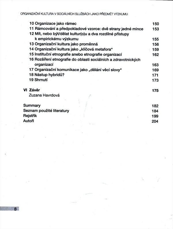 Monografie přináší přehled teoretických rámců i metodologických přístupů, kterými lze nahlížet na organizační kulturu i organizaci a zároveň výsledky empirických výzkumů organizační kultury v oblasti sociálních služeb.