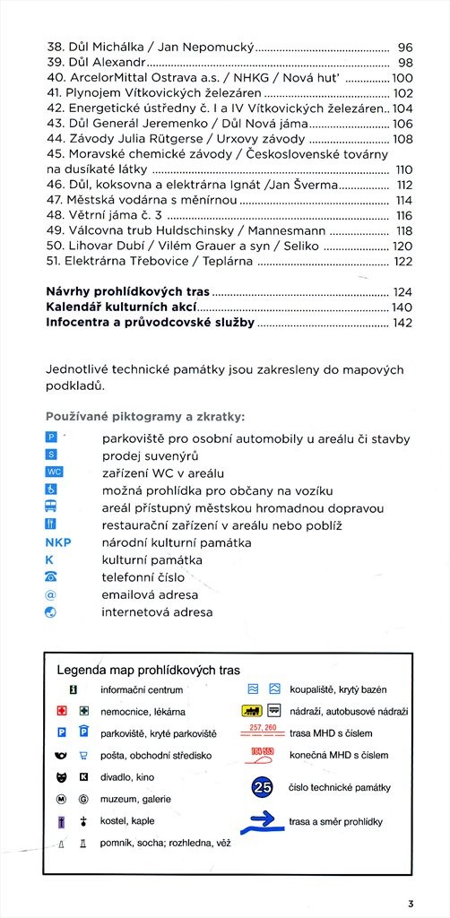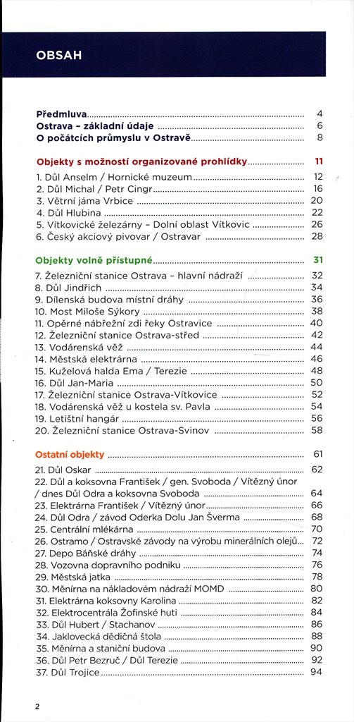 Průvodce přináší přehled industriálních památek města Ostravy (např. dolů, elektráren, vodárenských věží, vodáren, lihovarů, pivovarů, štol, železničních stanic nebo plynojemů), které jsou volně přístupné, mohou zde být prováděny organizované prohlídky nebo jde o uzavřené objekty. Úvod obsahuje stručné informace o metropoli Moravskoslezského kraje a počátcích zdejšího průmyslu. Nechybí ani návrhy prohlídkových tras po Ostravě a přehled ostravských kulturních akcí.