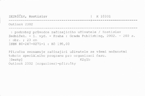 Tento organizér slouží jako diář, správce kontaktů i pomocník při vyřizování pošty. Uživatel se seznámí se všemi nejdůležitějšími možnostmi využití Outlooku 2002: zadávání a správa kontaktů, elektronická pošta, elektronický kalendář, práce s úkoly, využití deníku. Navíc příručka přináší mnoho rad, typů a návodů, jak co nejefektivněji využít tohoto užitečného pomocníka. Doplněno seznamem klávesových zkratek a rejstříkem pojmů.