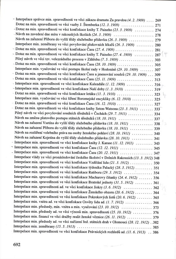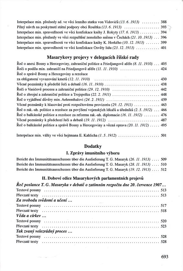 Sborník. Projevy, interpelace,pozměňovací návrhy a poznámky z období, kdy Masaryk vykonával druhý a třetí poslanecký mandát. Dokumenty jsou rozděleny do oddílů podle toho, ve kterém zastupitelském orgánu byly proneseny a vztahují se k různým tématům (politickým, sociálním, kulturním atd.)