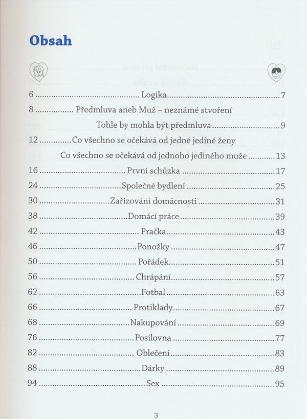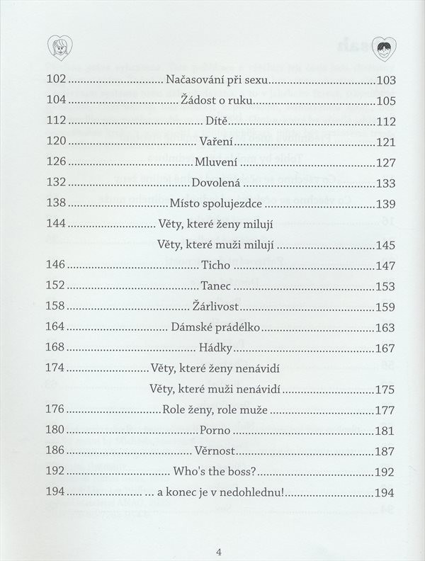 V knize jsou vylíčeny radosti i strasti partnerského soužití. Je zde všechno, co se den co den odehrává v normálních vztazích. Autoři popisují různá úskalí párového soužití a to jak z pohledu muže, tak z pohledu ženy. Je zde řeč např. o zařizování společného bytu, domácích pracích, dovolené, dítěti, sexu, sňatku, vaření, atd.