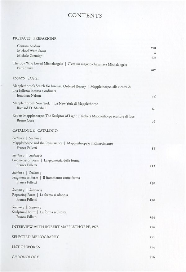 Monografie, jež doprovodila výstavy snímků slavného amerického fotografa ve Florencii a Luganu. Zaměřuje se na jeden aspekt Mapplethorpeovy tvorby: na hledání dokonalé umělecké formy. Připomíná souvislost jeho díla a klasického (renesančního) umění.