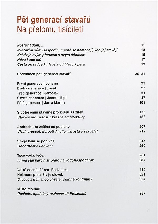Obrazová publikace vydaná u příležitosti 115. výročí rodinné stavební firmy Podzimkových, která žije v západomoravském městě Třešti a jedním z jejích posledních projektů je rekonstrukce Malostranské besedy v Praze.