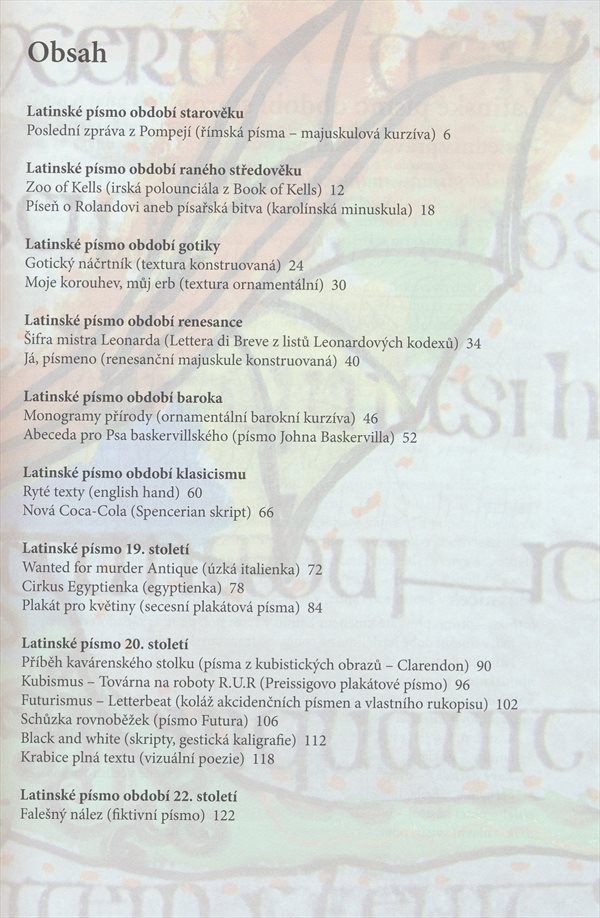 Kniha výtvarníka a učitele Daniela Korába představuje tvůrčím způsobem vývoj našeho písma – latinky a nabízí možnost prakticky si vyzkoušet použití historického písma, naučit se je poznávat, rozlišovat a dozvědět se o nich některé zajímavosti.