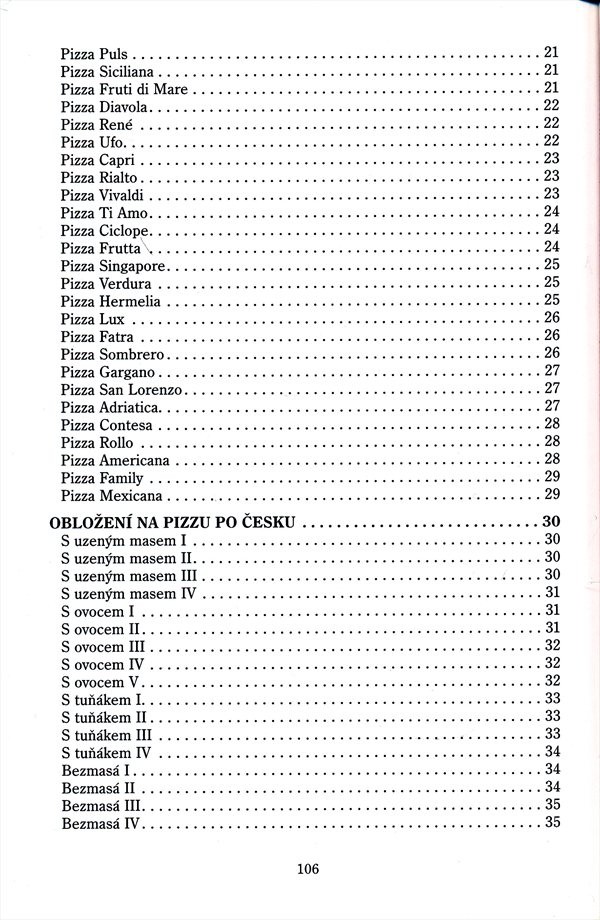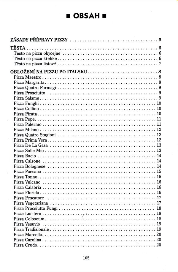 Kuchařka ve stručnosti seznamuje s přípravou základního těsta na pizzu a uvádí obložení na pizzu po italsku a obložení na pizzu po česku, s možností mnoha variant a obměn. Předpisy obsahují název pokrmu, přehled surovin pro jednu porci, postup přípravy a na přílohách barevné fotografie pokrmů.