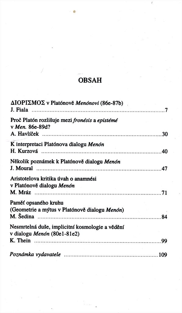 Sborník obsahuje příspěvky, které byly přednesené v říjnu 1998 v rámci symposia Platónův dialog Menón.