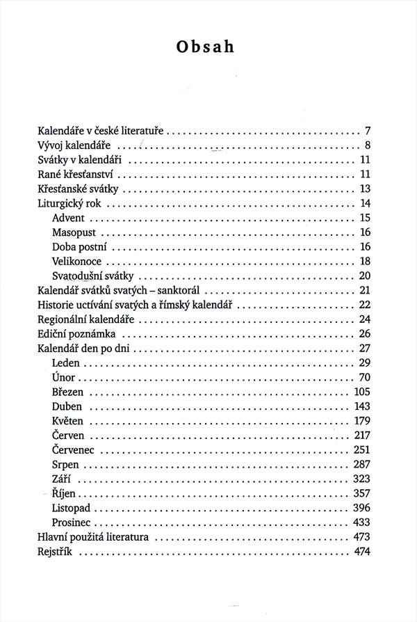 Úvod je věnován vzniku a vývoji kalendáře, kalendářům v české literatuře, křesťanskému kalendáři a nejdůležitějším obdobím a svátkům liturgického roku. U jednotlivých jmen je uveden jejich původ, význam a symbolika; případně významní nositelé. Encyklopedie vychází z občanského a křesťanského (římskokatolického) kalendáře. Závěr tvoří jmenný rejstřík.
