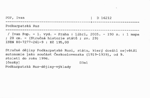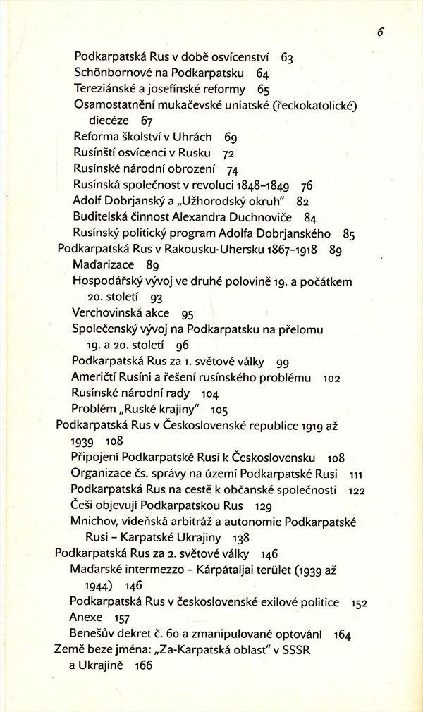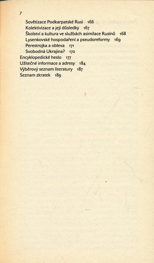 Přehledné dějiny Podkarpatské Rusi zmiňují i dekret prezidenta Beneše č. 60/1945 Sb., o zbavení obyvatel Podkarpatské Rusi (Rusínů) československé státní příslušnosti a popisují ke konci knihy i jejich život na Ukrajině do 90. let 20. století. Publikace je doplněna encyklopedickým heslem Podkarpatská Rus, adresami ukrajinských zastupitelstv v České republice, přehledem literatury a seznamem zkratek.