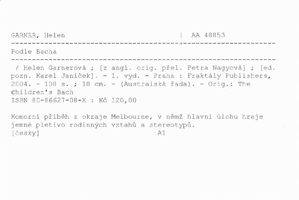 Autor | Helen Garnerová ; [ed. pozn. Karel Janíček] ; [z angl. orig. přel. Petra Nagyová] |