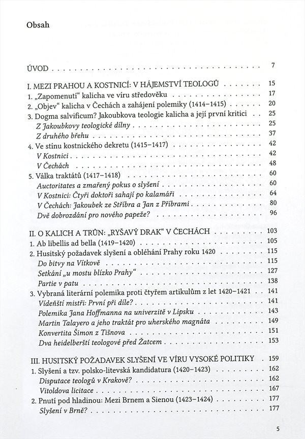 Monografie českého teologa se zabývá polemikou mezi římskokatolickou a husitskou církví o laickém přijímání eucharistie pod "obojí" způsobou a disputacemi o čtyřech pražských artikulech.