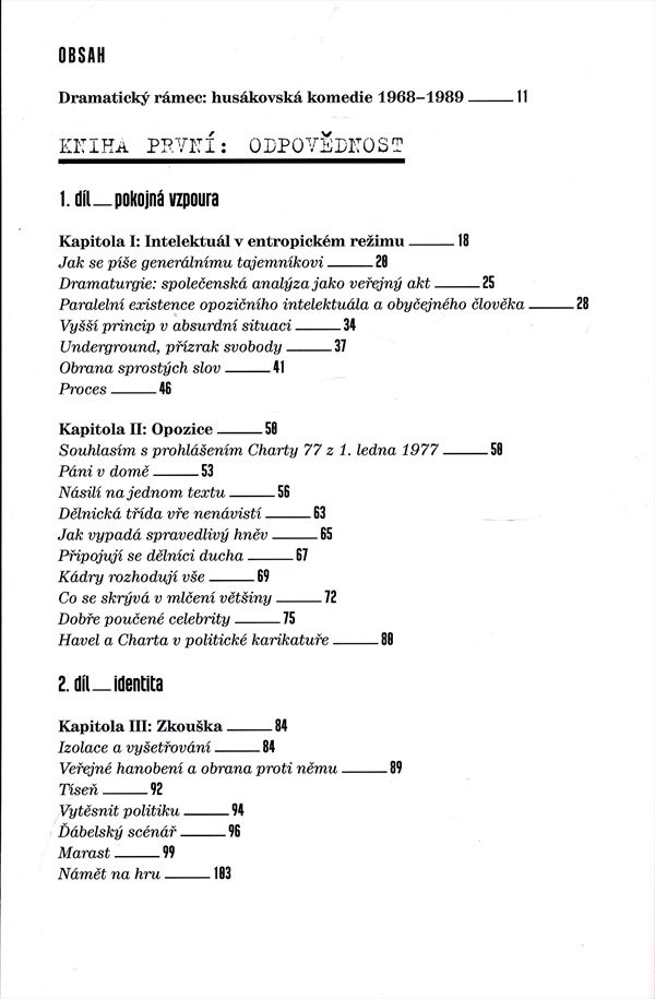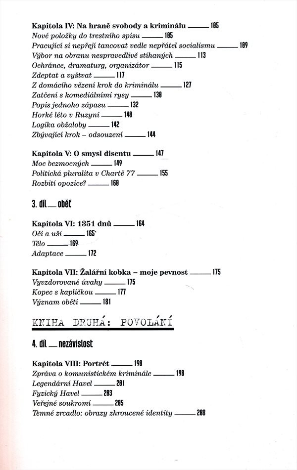 Životopisná studie se snaží zmapovat Havlův život v průběhu let 1975-1989. Začíná Havlovým kritickým dopisem generálnímu tajemníkovi G. Husákovi, pokračuje výkladem o Chartě 77 a podílu Václava Havla na její podobě, jeho uvězněním, následným životem od konce 70. let do pádu komunistického režimu; autor sleduje Havlův osobní život, opakované věznění i jeho činnost disidenta. Pozornost je věnována rovněž průběhu sametové revoluce a Havlově účasti v této historické události r. 1989. Výklad je zakončen nástupem V. Havla do prezidentského úřadu. Havlův život je zasazen do kontextu s politickým vývojem v Československu v průběhu 70. a 80. let minulého století. Práce se opírá o archivní materiály.