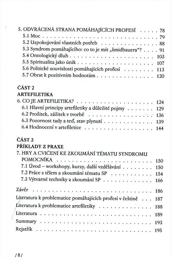 Kniha je určena pracovníkům pomáhajících profesí od pedagogů a lektorů přes zdravotníky, sociální pracovníky až po terapeuty, tedy všem, kdo pracují s lidmi ve vztahu a používají k tomu svou osobnost. Nabízí čtenáři možnost nahlédnout do podivuhodných a obecně problematických zákoutí pomáhající profese a hledá způsob, jak s těmito místy smysluplně zacházet. Poodhaluje možné motivace k volbě těchto povolání a zamýšlí se nad odvrácenou stranou pomáhání. Druhá část knihy se věnuje popisu a vysvětlení artefiletiky, výtvarné a tvořivé metody, která může být účinným a bezpečným nástrojem na cestě osobního zkoumání a dotýkání se výše uvedených citlivých témat. Třetí část knihy pak představuje praktické ukázky, jak autorka používá práci s tělem a výtvarnými prostředky právě při zkoumání a poznávání aspektů spojených s problematickými místy pomáhajících profesí. Nakladatelská anotace.