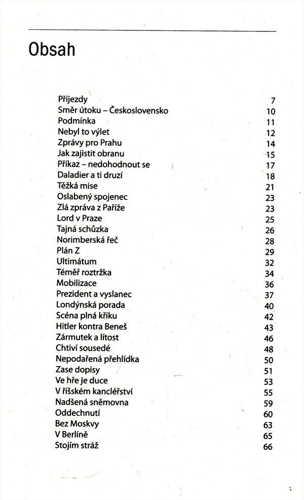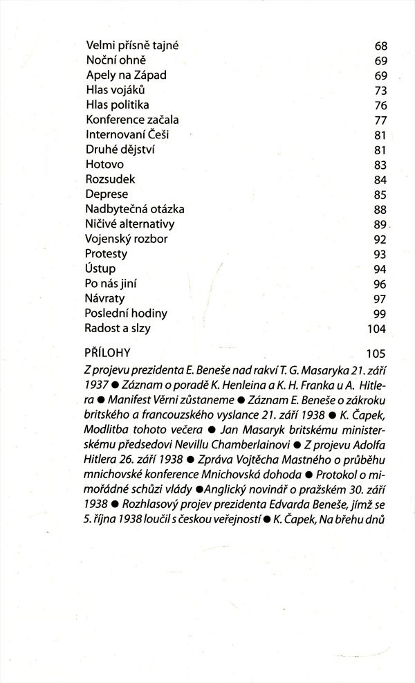 Kniha vzešlá z pera renomovaného historika zaznamenává dění v Evropě během září roku 1938 a především z jeho konce, kdy došlo k podepsání Mnichovské dohody. Je zde věnována rovněž pozornost dění, které podpisu tohoto dokumentu předcházelo: např. Hitlerovým plánům na likvidaci československého státu, postoji západních mocností k československému problému, průběhu jednání britského premiéra Chamberlaina s Hitlerem na Berghofu a v Bad Godesbergu i územním požadavkům československých sousedů. Kvaček ve své práci také podrobně popisuje jednání čtyř mocností v Mnichově a jeho důsledky v podobě Mnichovské dohody, podle které muselo Československo odstoupit pohraniční území osídlené Němci. Závěr mapuje přijetí mnichovského diktátu Československem. Text je doplněn fotografiemi. Přílohy.