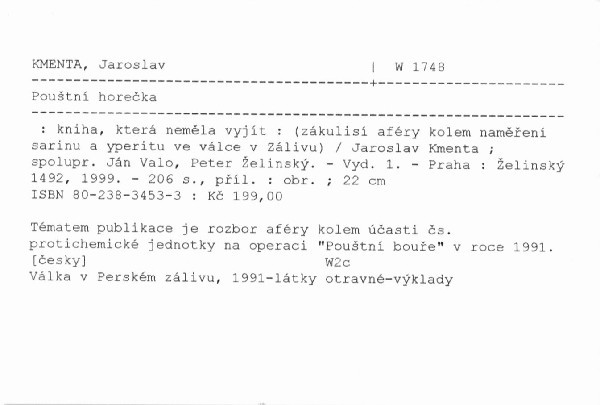 | Podnázev | kniha, která neměla vyjít : (zákulisí aféry kolem naměření sarinu a yperitu ve válce v Zálivu) |