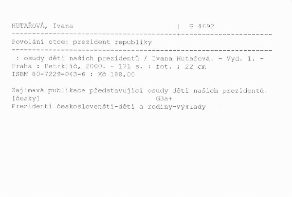 Kniha zabývající se rodinnými poměry našich devíti prezidentů. Podává zajímavý pohled na soukromí těchto vysoce postavených mužů, na jejich vztah k rodině a dětem i na to, jak postavení otce ovlivnilo jejich život. Úroveň zpracování jednotlivých osobností je dána dostupností dobových materiálů.