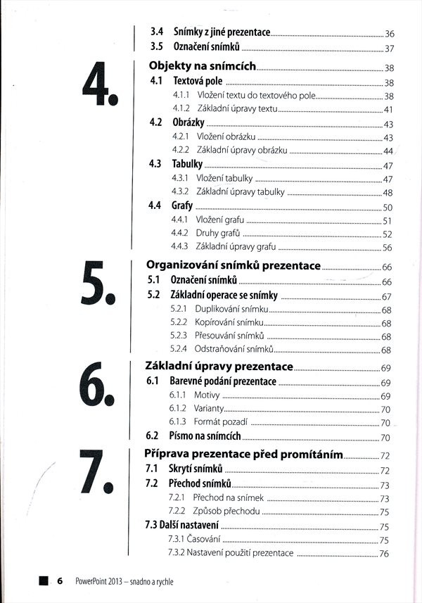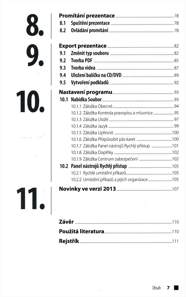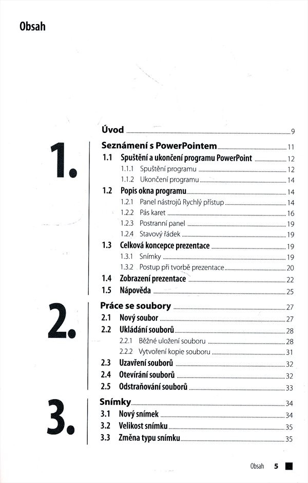 Publikace seznamuje s rozhraním programu, který je součastí balíku aplikací Office od firmy Microsoft. Popisuje základní ovládání PowerPointu, možnosti vložení a úpravy snímků, způsoby vkládání objektů či organizování snímků v prezentaci. Další kapitoly se zabývají přípravou prezentace před promítáním, exportem prezentace a nastavením programu.
