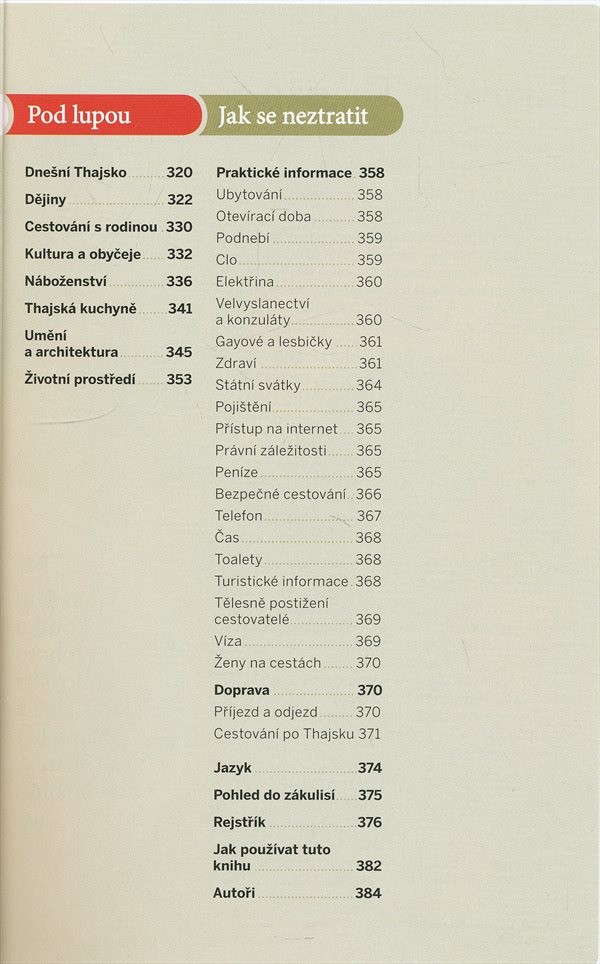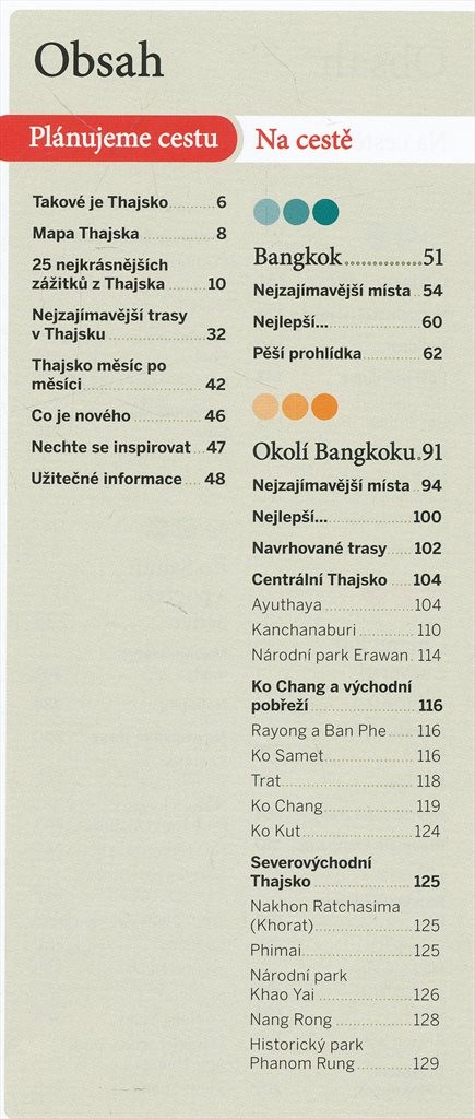 Představuje jednotlivé oblasti a jejich nejzajímavější místa, pamětihodnosti, zajímavosti ap. U každého místa jsou navrženy trasy. Na konci knihy jsou uvedeny stručné dějiny a informace o dnešním Thajsku, o kultuře, zvycích, náboženství, kuchyni, umění a životním prostředí. Úplný závěr obsahuje praktické rady pro turisty ohledně ubytování, stravování, bezpečného cestování atd.