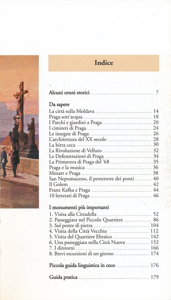 Průvodce po Praze s více než 200 barevnými fotografiemi a plánkem pro italsky mluvící návštěvníky města.