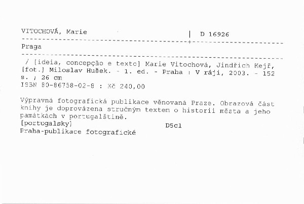 Výpravná fotografická publikace věnovaná Praze. Obrazová část knihy je doprovázena stručným textem o historii města a jeho památkách v portugalštině.